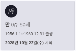 - 만 65~69세 (1956년 1월 1일~1960년 12월 31일 출생자): 2025년 10월 22일(수)부터 시작