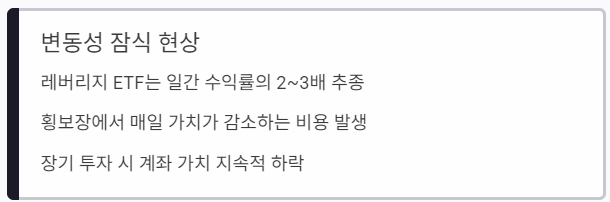 | 시장 변동성 | 횡보장에서는 음의 복리 효과로 인해 가만히 있어도 자산이 잠식됨 |