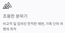- 여행 팁: 해변 주변에 편의시설이 많지 않으니, 캠핑이나 피크닉 시 필요한 물품은 미리 준비해 가야 합니다.