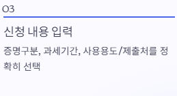| 3단계 | 신청 내용 입력 (핵심!) | 증명구분 (근로소득자용, 종합소득세 신고자용 등), 과세기간 (필요한 연도), 사용용도/제출처를 정확히 선택합니다. |