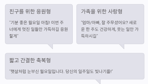 - 힘찬 시작 응원형: "김 대리님! 주말 동안 푹 쉬셨죠? 이번 주 프로젝트 마감 잘 해낼 수 있도록 제가 옆에서 열심히 도울게요. 힘내요!"