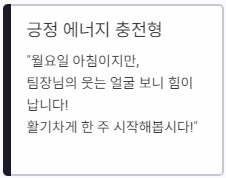 - 긍정 에너지 충전형: "월요일 아침이지만, 팀장님의 웃는 얼굴 보니 힘이 납니다! 활기차게 한 주 시작해봅시다!"