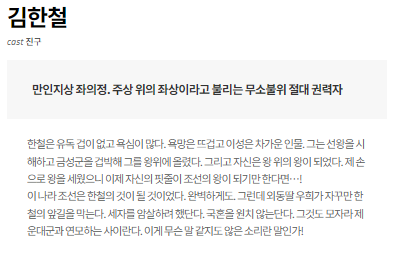 | 김한철 | 진구 | 동기: 절대 권력 유지. 역할: 모든 암투를 조종하는 배후의 실세. |