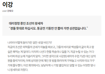 | 이강 | 강태오 | 동기: 복수심과 무능한 척 가장. 역할: 비선 실세에 맞설 진정한 영웅으로 성장하는 세자. |
