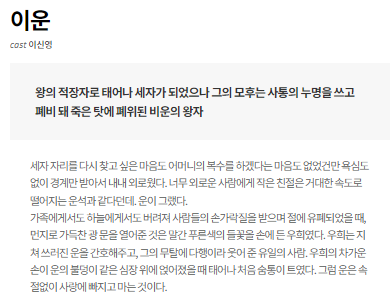 | 이운 | 이신영 | 동기: 상처와 고독. 역할: 이강과 권력적으로 대립하는 비운의 라이벌이자 금지된 사랑의 주체. |