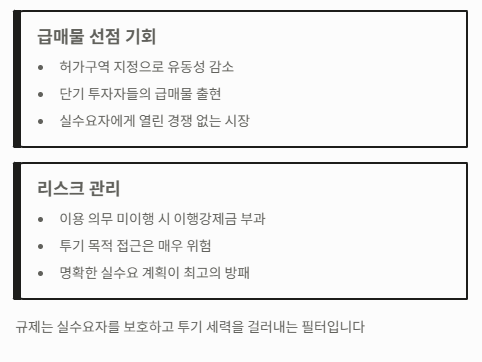 허가구역으로 지정되면 당장 팔고 싶어도 실수요자가 아니면 매수할 수 없기 때문에, 거래 자체가 줄어들고 유동성이 떨어집니다. 이로 인해 단기 시세차익을 노렸던 투자자들이나 급전이 필요한 소유주들은 어쩔 수 없이 시세보다 낮은 급매물을 내놓는 경우가 생깁니다. 실수요를 갖춘 매수자에게는 이 급매물을 선점할 수 있는 **'경쟁 없는 시장'**이 열리는 셈입니다.