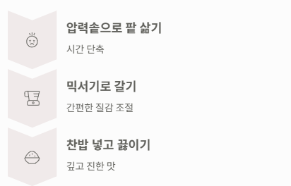 압력솥으로 팥을 푹 삶아 믹서기로 갈아낸 뒤 찬밥을 넣어 끓이면 조리 시간을 단축하면서도 깊고 진한 전통의 맛을 그대로 재현할 수 있습니다.