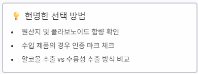 프로폴리스 제품을 고를 때는 원산지와 더불어 플라보노이드 함량을 반드시 확인해야 합니다. 수입 제품의 경우 해당 국가의 인증 마크가 있는지 체크하는 것도 현명한 방법입니다. 알코올 추출 방식인지 수용성 추출 방식인지에 따라 맛과 향의 강도가 다르므로 본인의 취향과 복용 편의성을 고려하여 선택하는 것이 좋습니다.