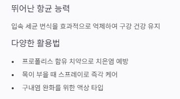 - 대표 제형: 캡슐, 액상(드롭), 스프레이, 캔디, 치약